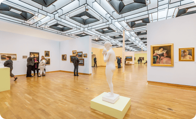Spacious galleries that showcase a diverse range of contemporary and modern art, including paintings, sculptures, installations, and multimedia works.